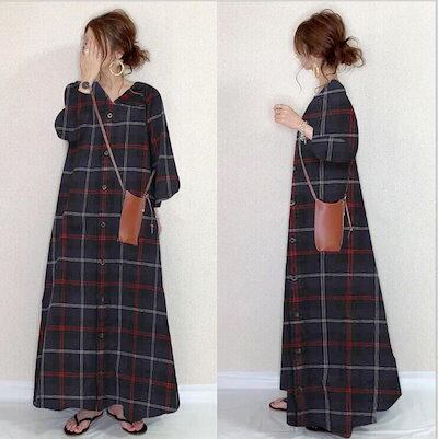 初秋 シャツワンピース 冬の インナー Vネック 長袖 おしゃれ 百掛け ワンピース チュ 総丈 レディース 綿麻 シャツワンピース ゆったり