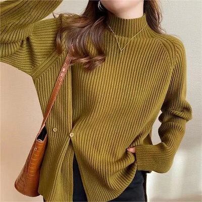 秋冬新作 韓国ファッション 無地 ニット スリット 3カラー セーター ハイネック 厚手 リブニット トップス ニット レディース ニット カシミヤタッチ 福袋
