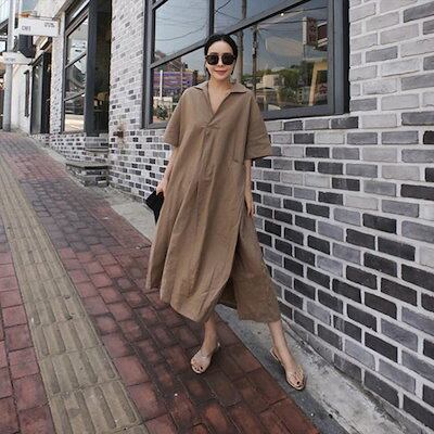 ポケット付きスキッパーリネンワンピース韓国ファッションゆったり レディース リネンワンピース2024春夏新作レディース