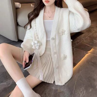 ベーシックニット フレンチ小香風コサージュセーターニットカーディガンレディースチュニックミンクフロマージュカレッジ風コートゆったりシックトップス