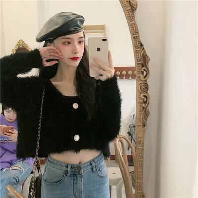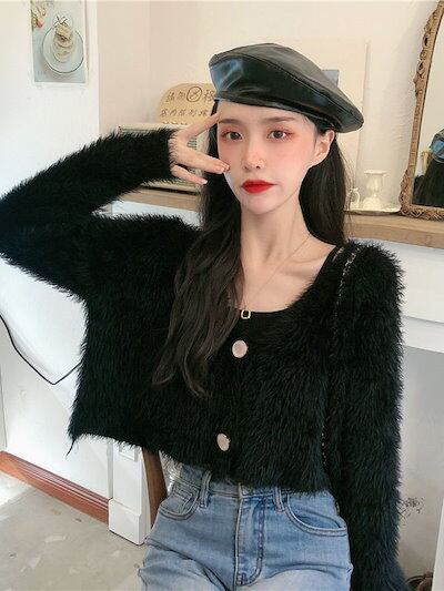 ベーシックニット ショート丈減齢Vネックニットカーディガンレディースミンクセーター秋の装いスリム長袖トップスミニコート