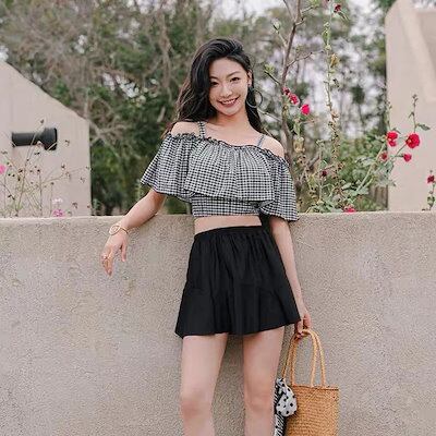 4月新品水着追加! レディース水着 サマーフリルサスペンダーショルダー水着 コンサババンドハイウエストスカート式セパレート水着