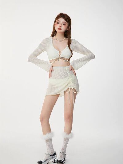 韓国ファッション レディース水着 ビキニ長袖ブラウスヒップスカート甘いベルト付きリゾート 水着 温泉
