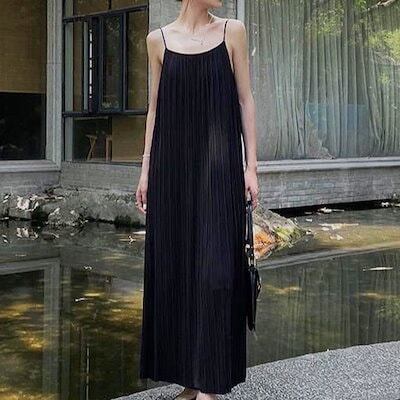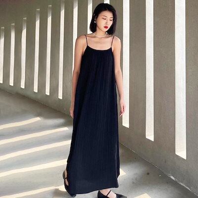 ヘビロテ!キャミワンピース 2024夏新品!!!夏 人気 韓国ファッション プリーツ ロングワンピース ドレス フレンチ ゆったり 無地 通勤 通学