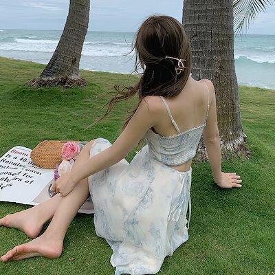 2024夏新品!!!夏 人気 韓国ファッション vネック花柄 ロングワンピース ドレス ウエスト引き締め キャミソールシフォン 通勤 通学