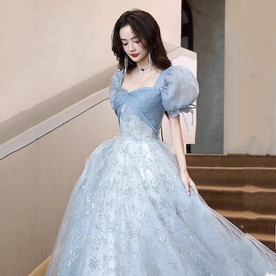 2024新品追加パーティドレス ブルー ワンピース 韓国ファッション プリンセススカート 卒業式 結婚式 誕生日 演奏会 花嫁 司会 ホスト パーティー
