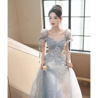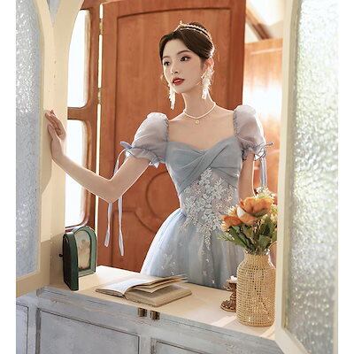 2024新品追加パーティドレス ブルー フランス ワンピース ドーパミン 韓国ファッション 卒業式 結婚式 誕生日 演奏会 花嫁 司会
