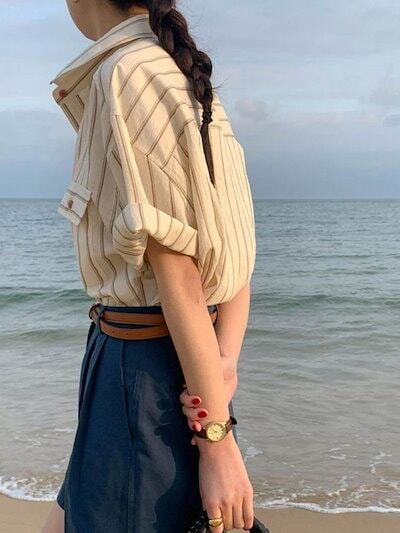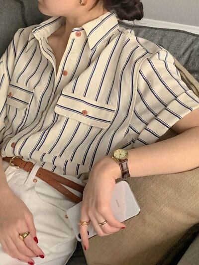 【3日以内出荷】今っぽシアーシャツ 通勤 夏の新作 フレンチレトロポケットストライプ 半袖 シャツ 日焼け止め トップス レディース 韓国ファッション