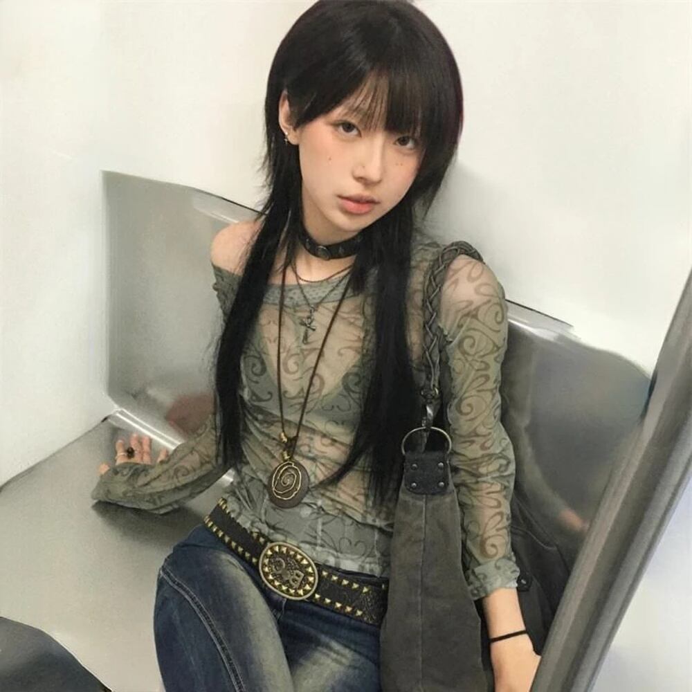 Houzhou-女性用グランジメッシュシャツ,和風,グリーン,ヴィンテージ,原宿,長袖,韓国ファッション,y2k T240926104907_01