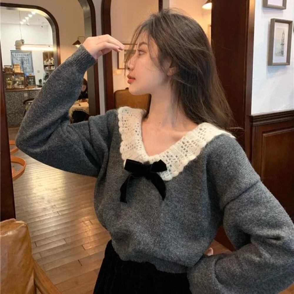 Deeptown-女性のカワイイスウィートプルオーバー、韓国スタイルのセーター、灰色の弓で編まれたクロップトップ、ヴィンテージパッチワークセーター、秋、冬 T240926105053_01