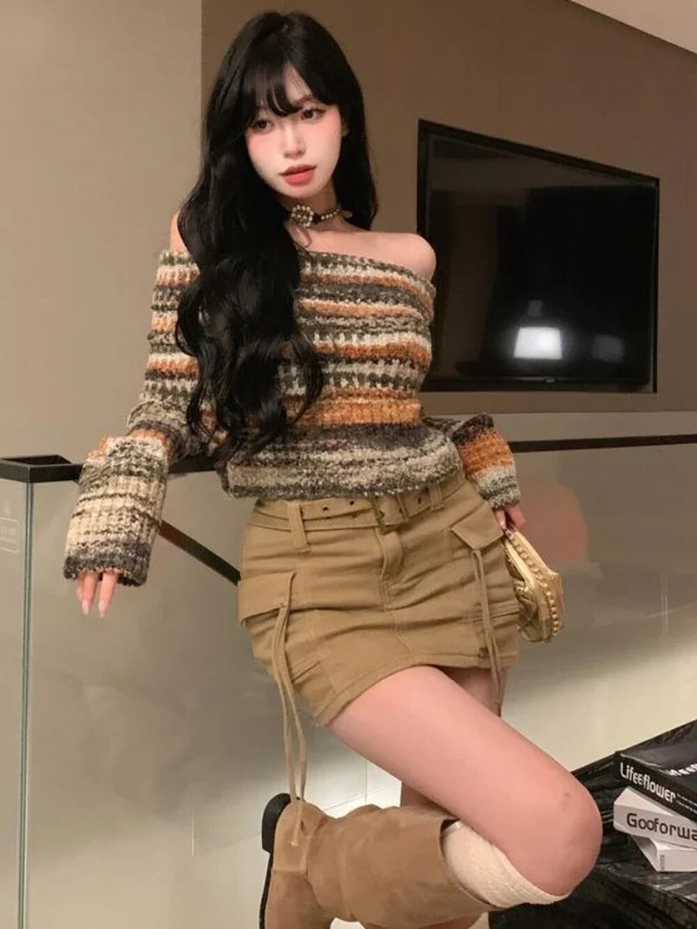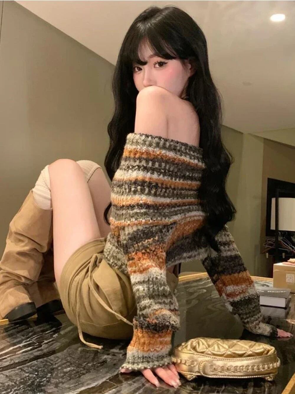 Deeptown-女性のヴィンテージストライプクロップドセーター、原宿、ヒップホップ、スリム、ニットジャンパー、甘い、オフショルダープルオーバー、韓国のトップス、y2k T240926105107_01