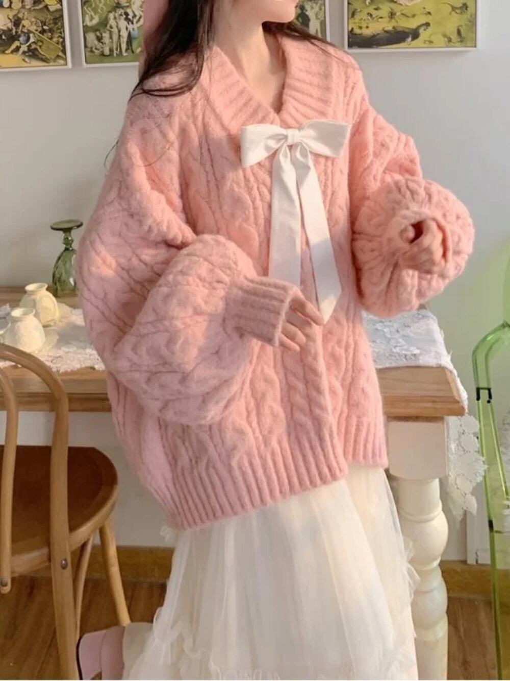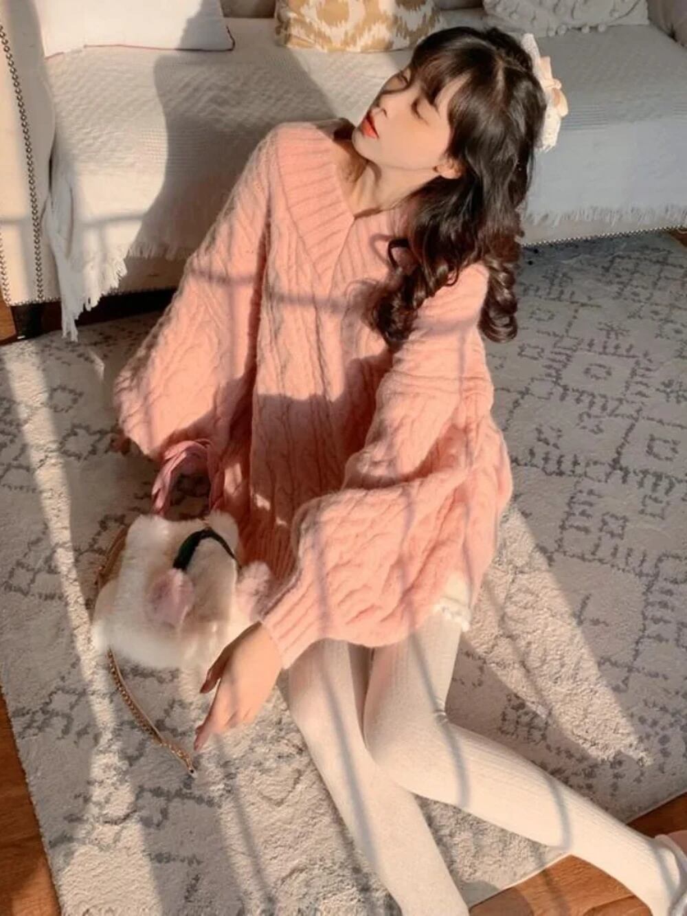 Deeptow-女性用Vネックボウルーズニットセーター、ピンクのカワイイプルオーバー、長袖、プレッピースタイル、甘い、秋、冬、2024 T240926105259_03