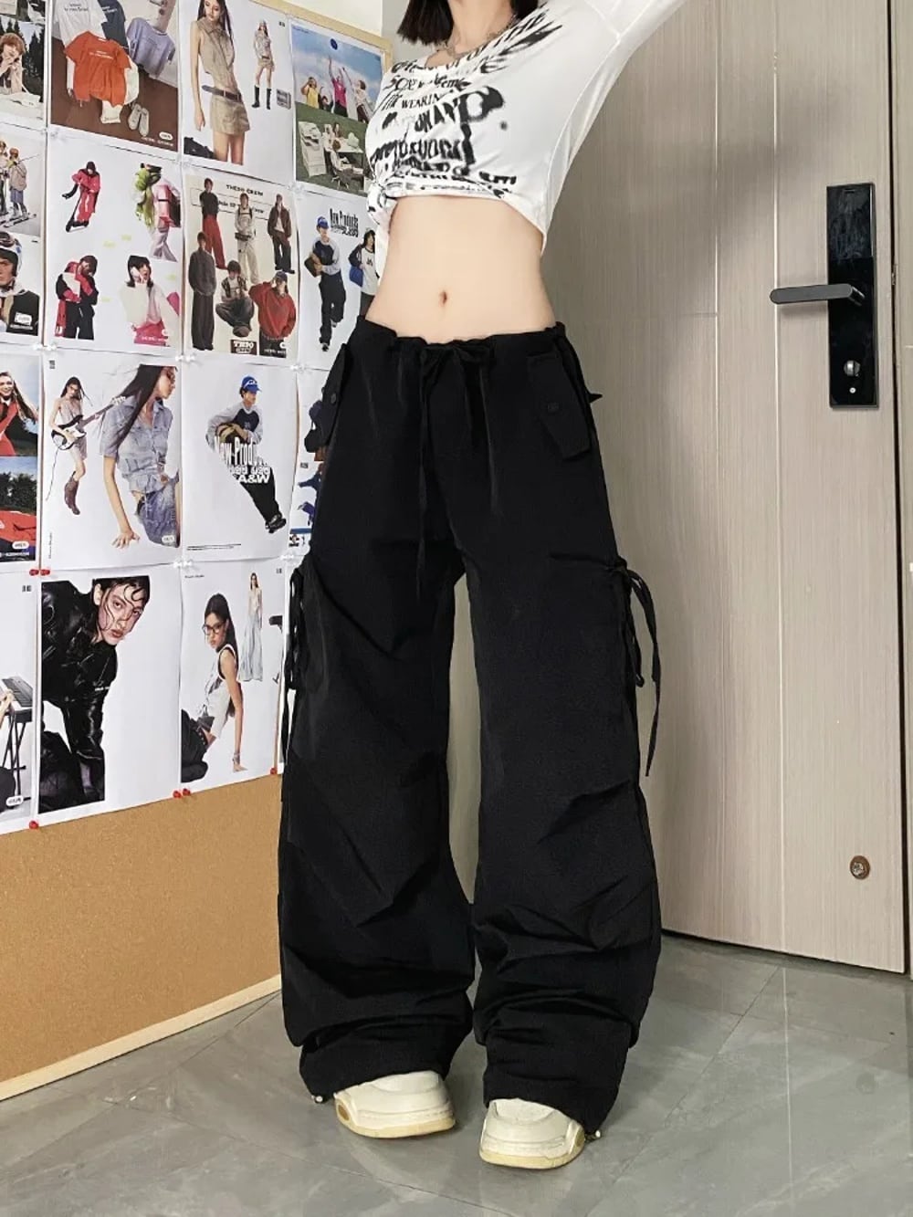 ディープタウンハイウエストワイドレッグパンツ、カワイイストリートウェア、韓国スタイル、ソリッドボウ包帯デザインポケット、特大パンツ、y2k、2024 T240926105354_01