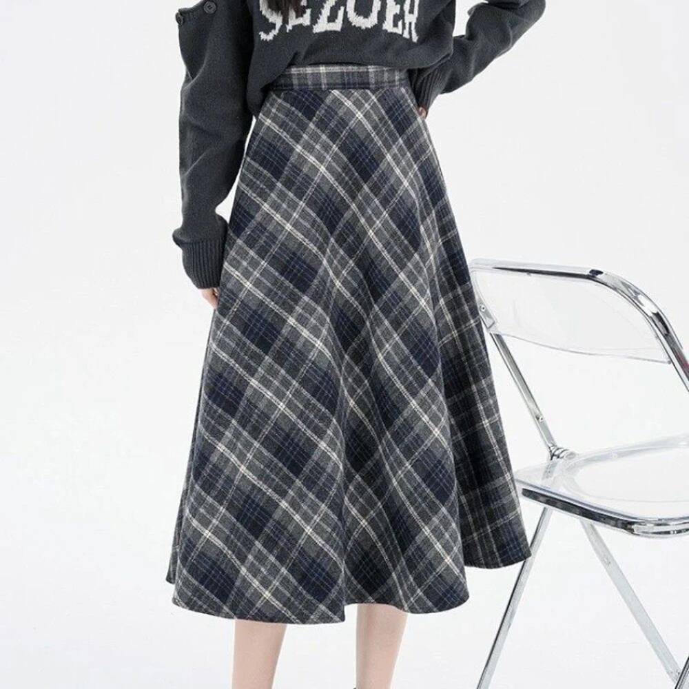 Deeptown-女性のヴィンテージチェック柄スカート、ロングスカート、ハイウエスト、空中ブランコミディ、レトロなストリートウェア、カジュアル、プレッピースタイル、秋、冬 T240926105428_01