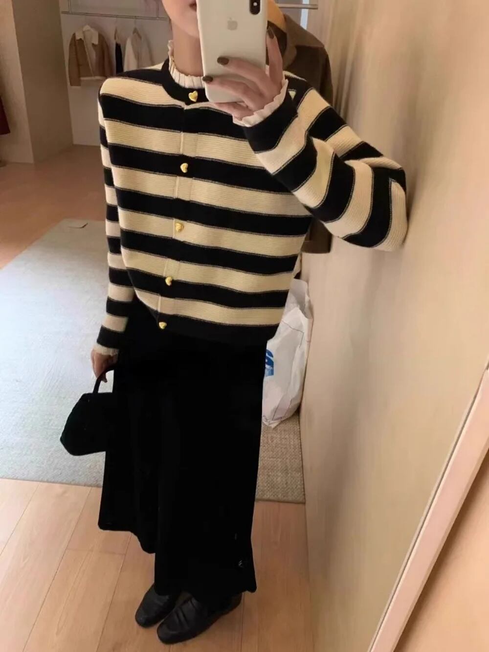Deeptown-女性の韓国スタイルのストライプニットカーディガン、エレガントなヴィンテージセーター、クラシックな女性のアウターウェア、エレガントなオフィスウェア T240926105554_01