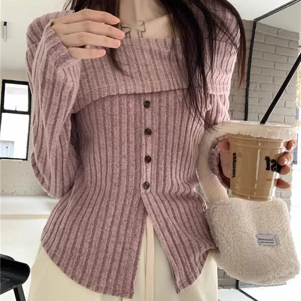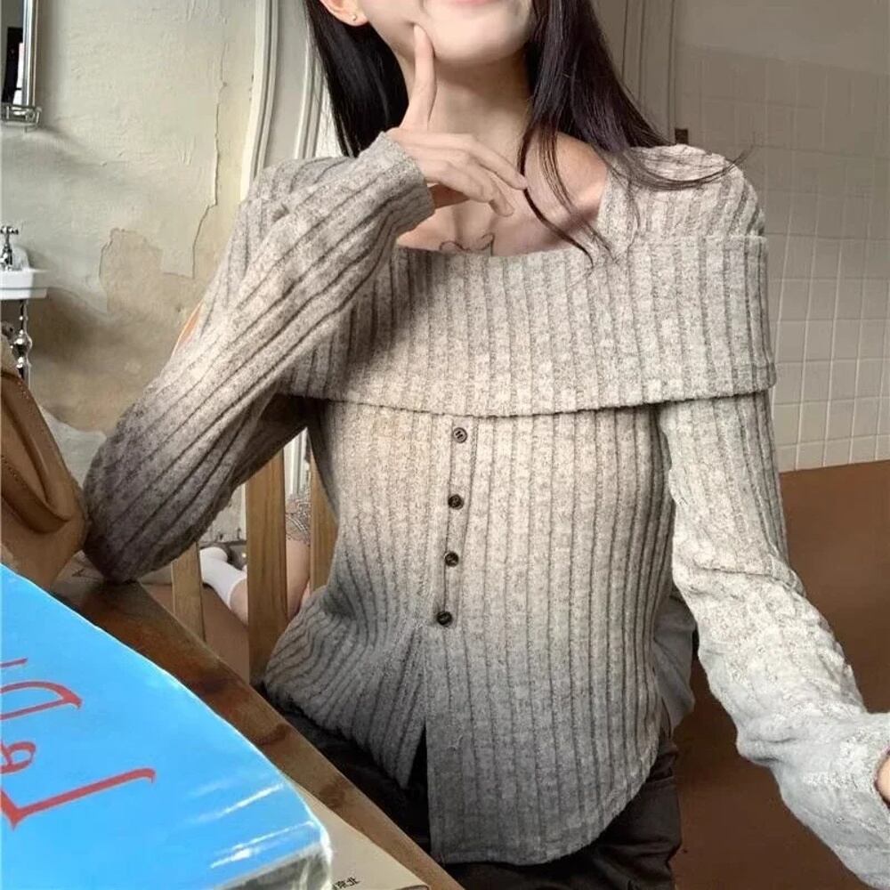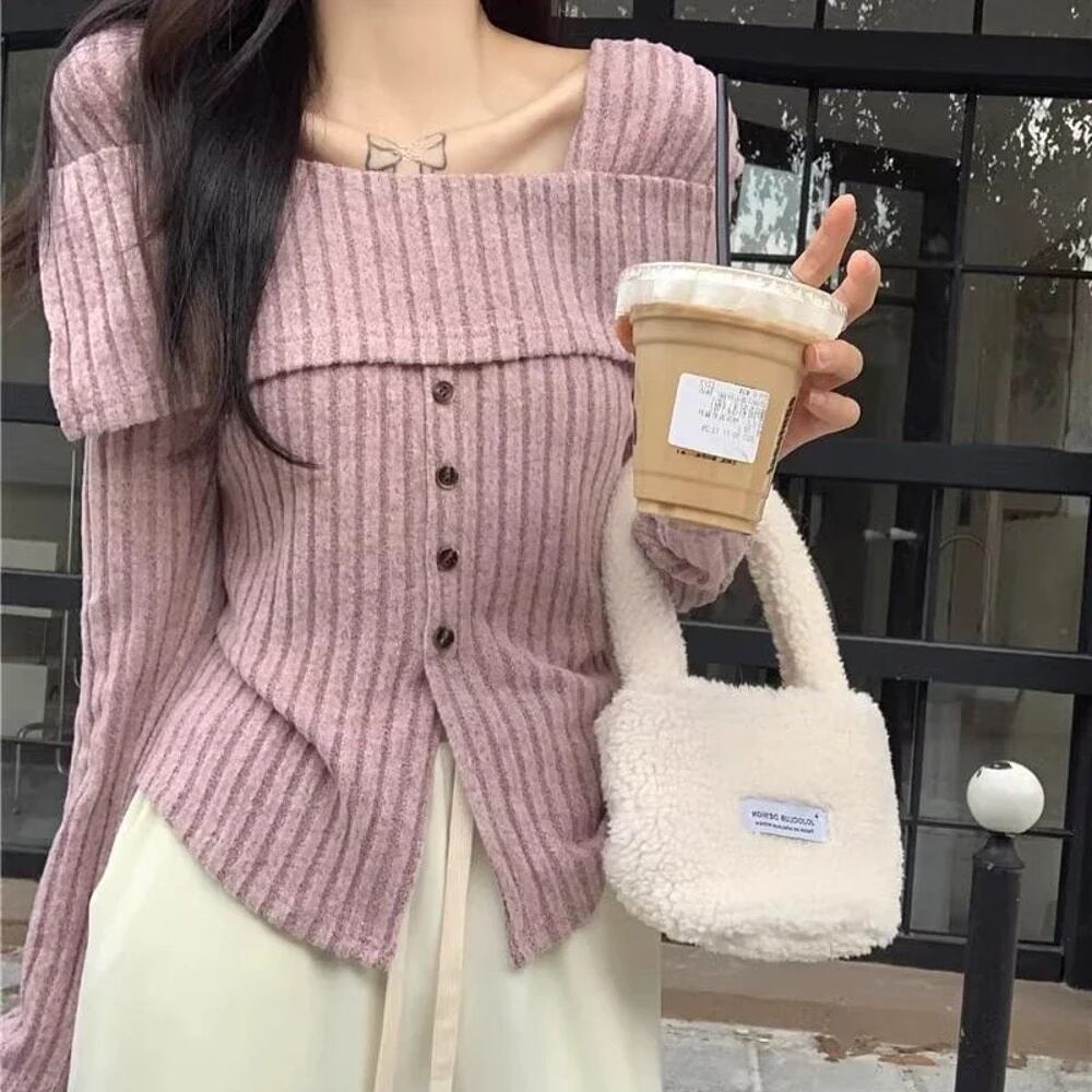 Deeptown-女性用スクエアネックニットセーター,長袖セーター,単色ジャンパー,甘い韓国のファッション,エレガント,セクシー,秋,冬 T240926105742_02