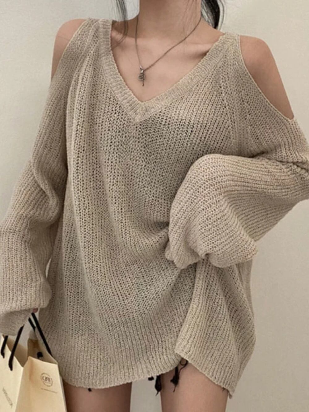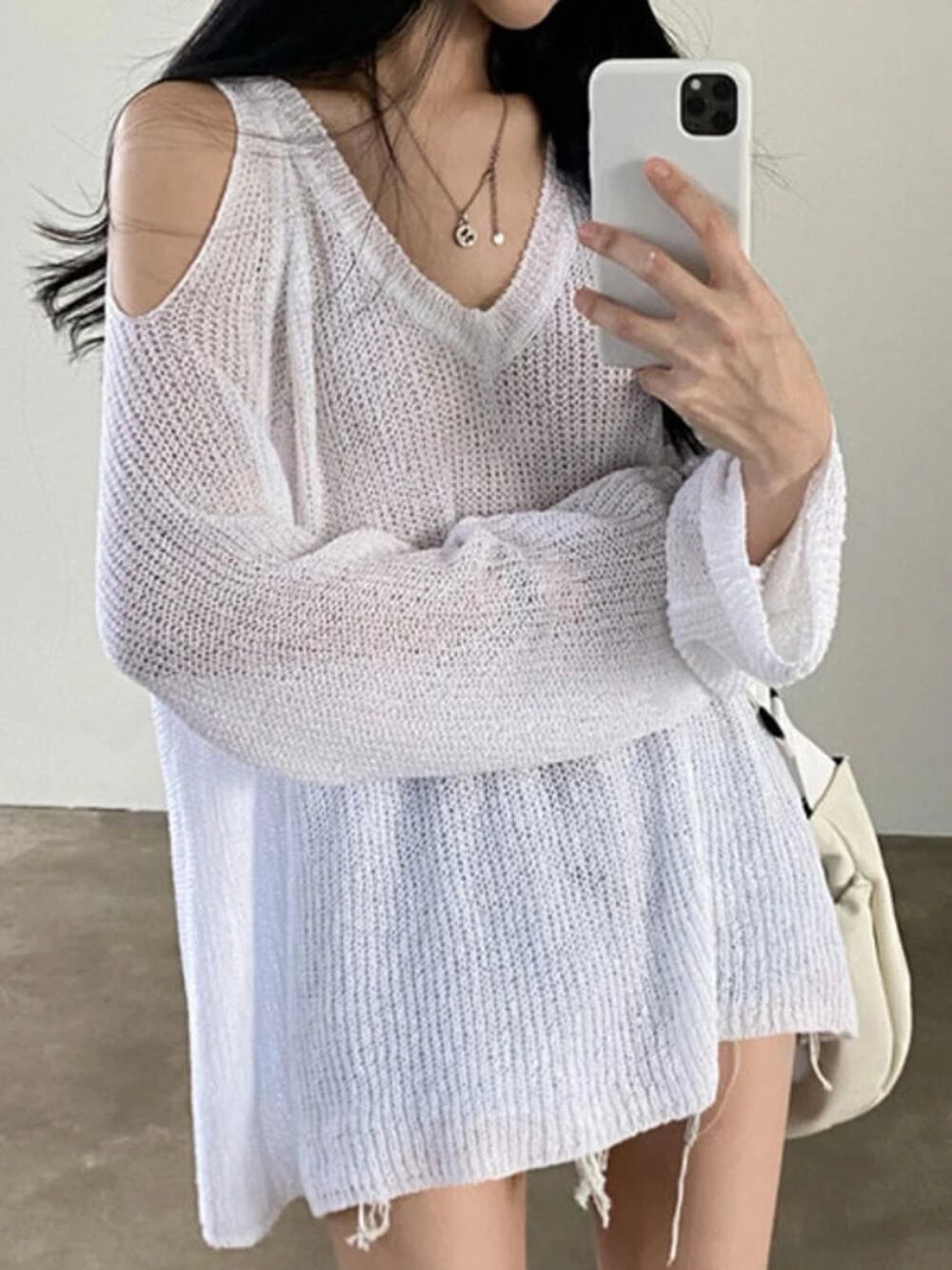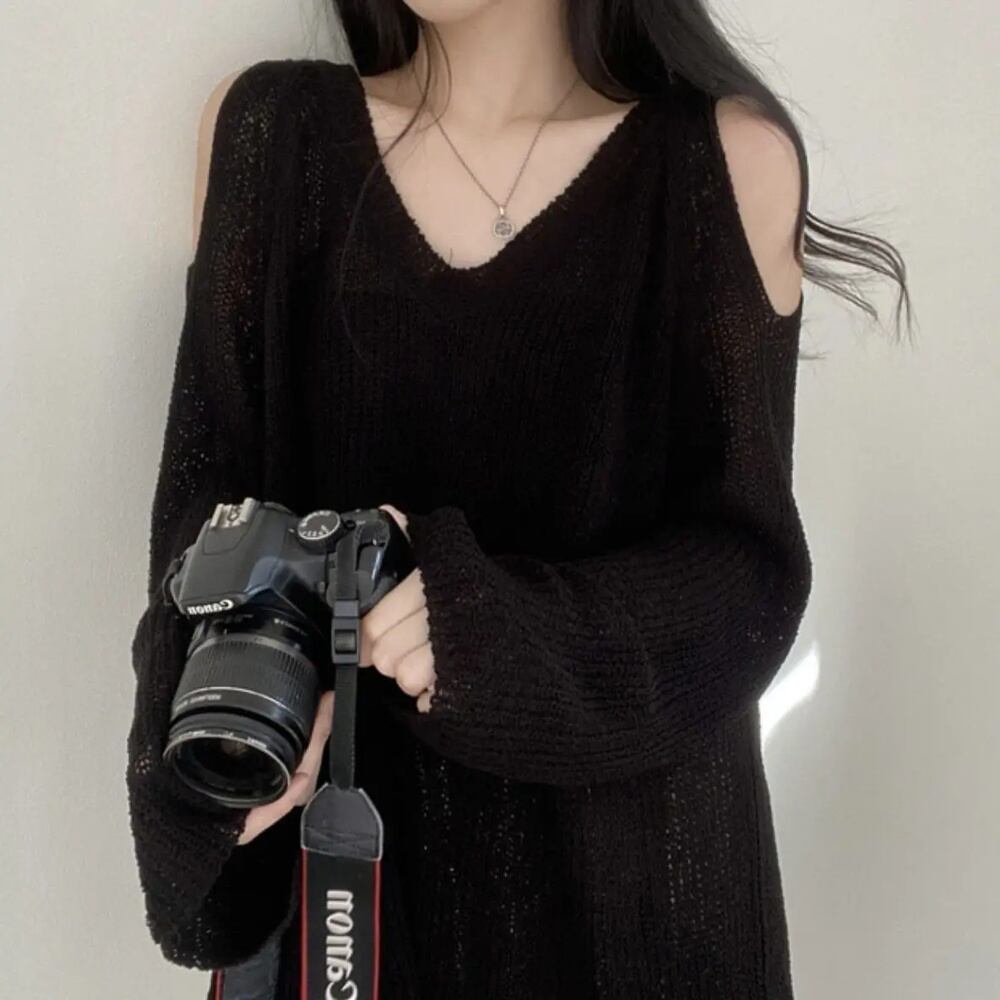 Deeptown-女性用ニットセーター,ハイストリートセーター,レトロ,Vネック,裸の肩,ルーズ,カジュアル,日焼け止め,エレガント T240926105836_01