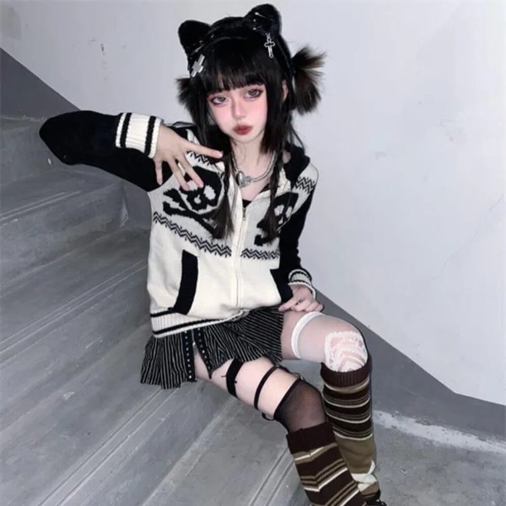 Deeptown-レディースヴィンテージ刺繍ハラジュクフード付きカーディガン、y2kゴシックセーター、ジッパーナイトウェア、日本パンクスタイル、秋、2000s T240926110033_01