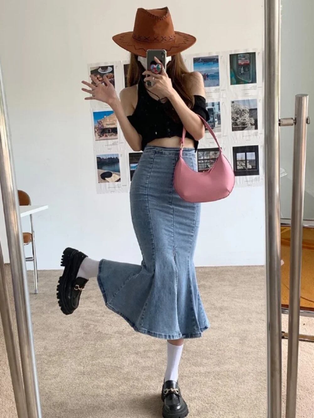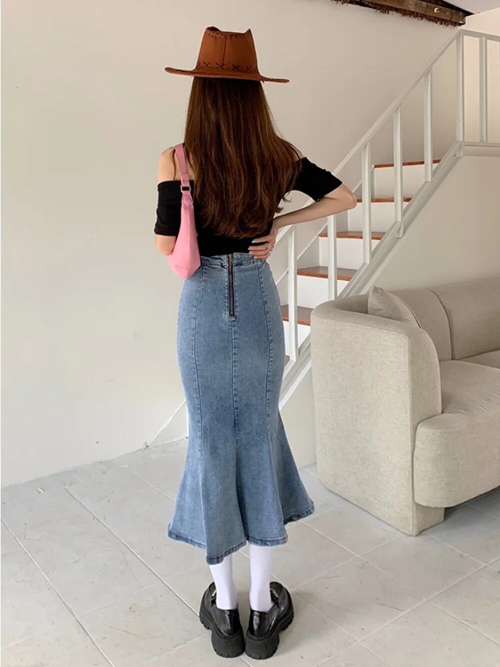 Deeptown-レディースデニムロングスカート,韓国のファッション,ハイウエスト,タイト,フラウンス,エレガント,シック,夏 T240926110105_01
