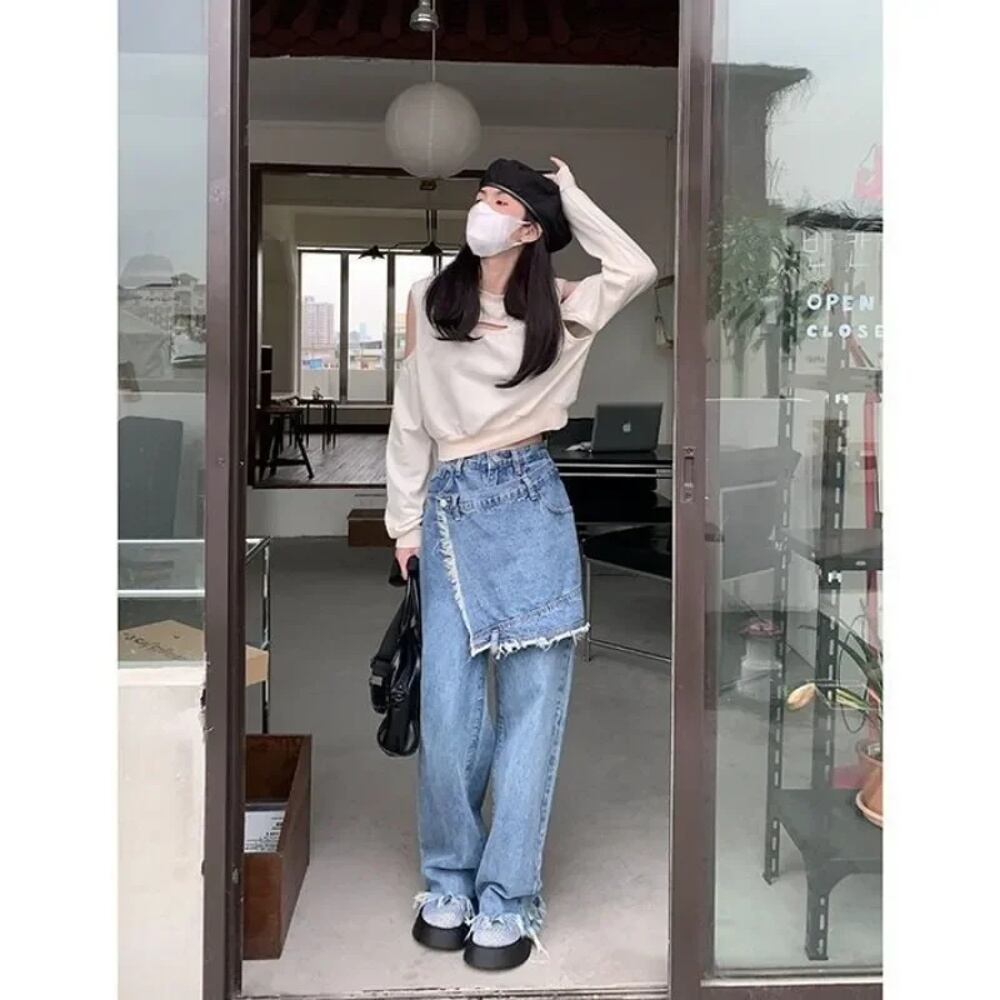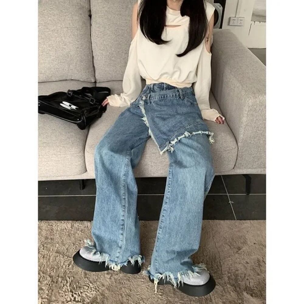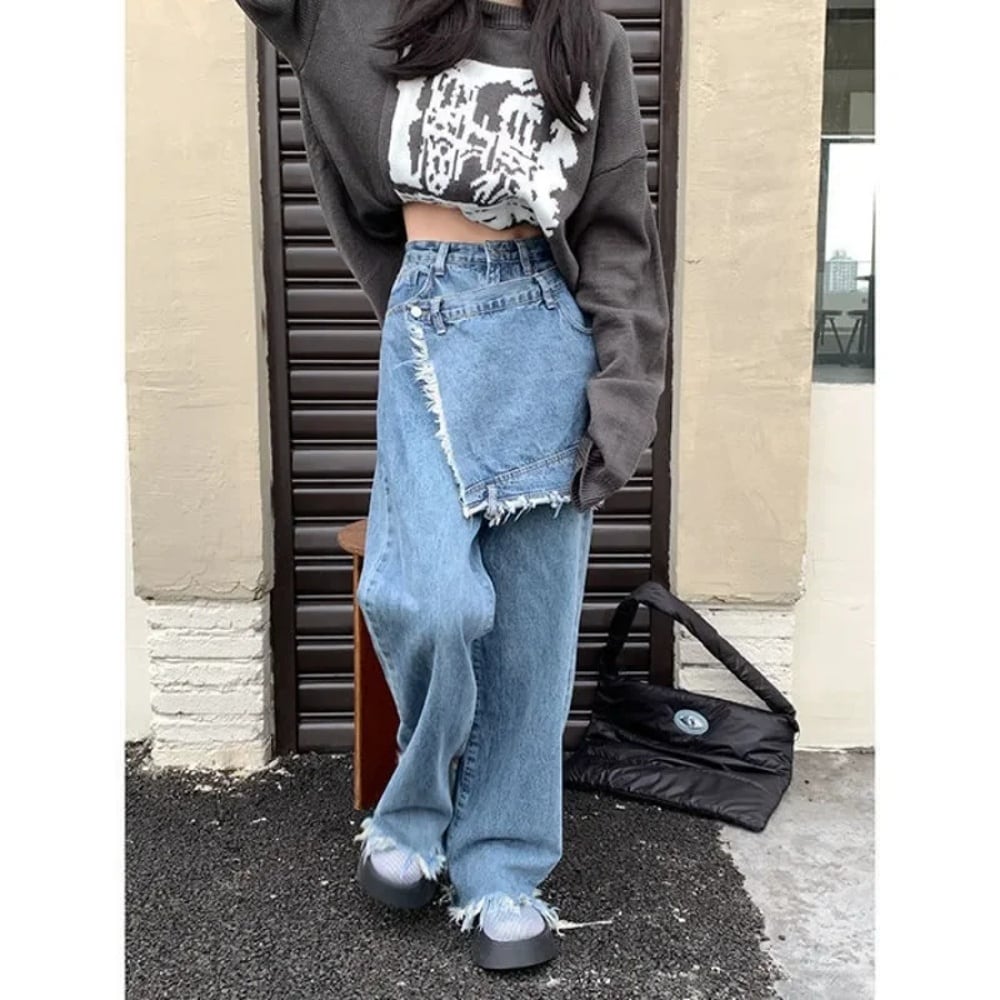 女性のためのdeeptownバギーパッチワークジーンズ、韓国のヴィンテージワイドレッグパンツ、ハイウエストストレートパンツのスカート、y2k T240926110135_01