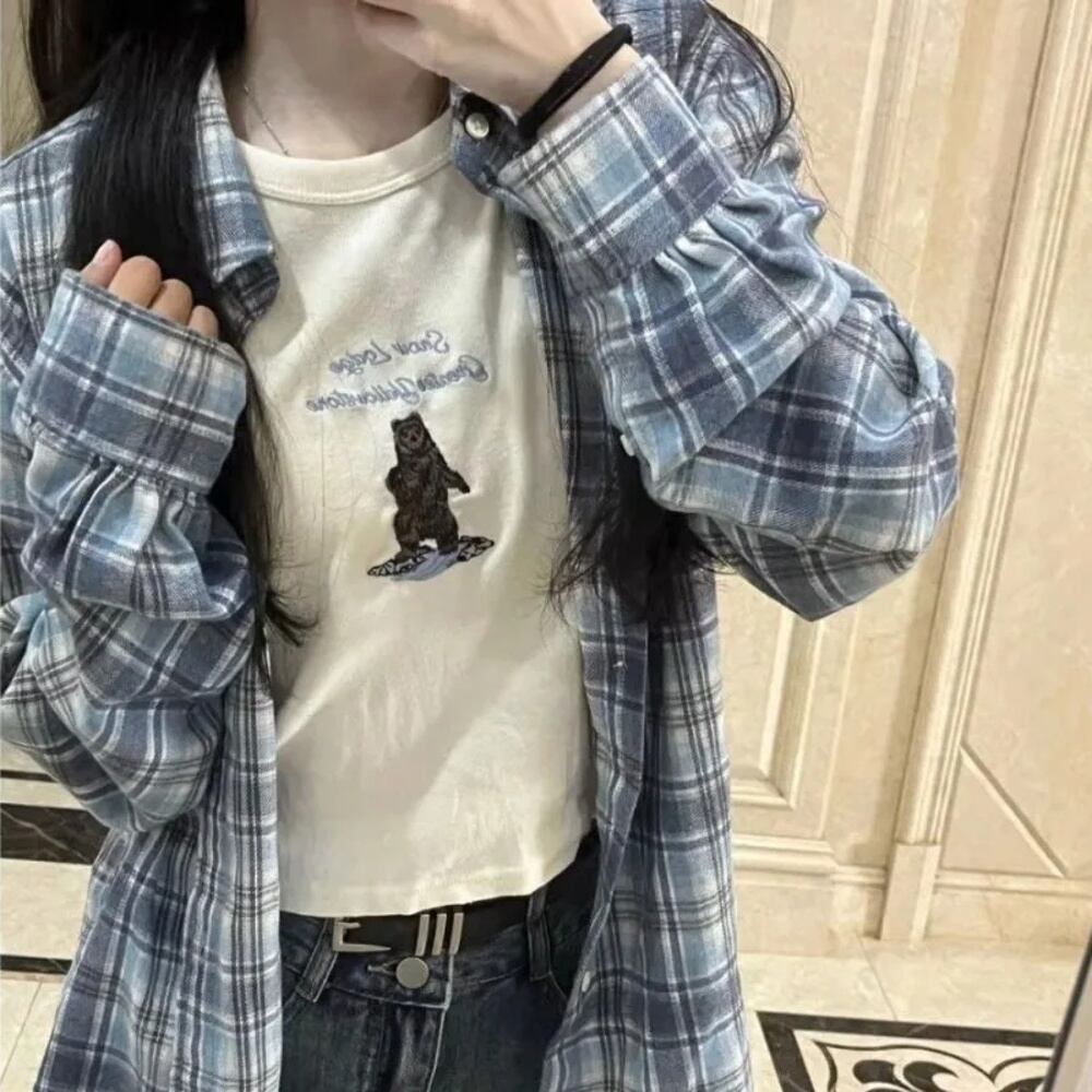 Deeptown-女性用長袖チェックシャツ,ヴィンテージ,特大,y2kブラウス,韓国スタイル,原宿ファッション,日本の服 T240926110220_01