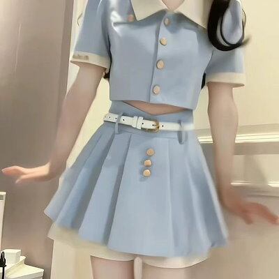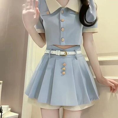 ワンピース夏 ブルーハイウエストプリーツスカート セットアップ 2点セット 涼しく楽ちんセットアップ韓国ファッション ドレストップス