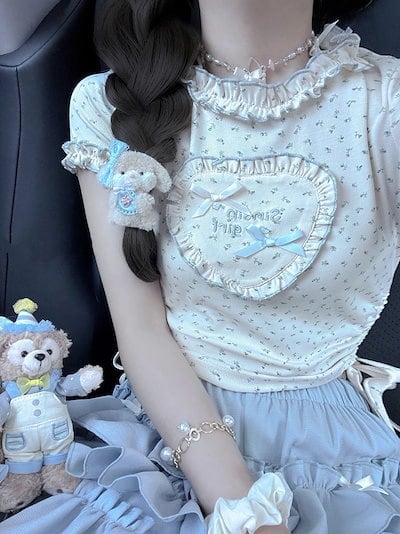 セットアップ 半袖 ドレス 涼しく楽ちんセットアップ韓国ファッション ブルーケーキショートスカート少女スイートスーツ ワンピース夏 花柄ハート Tシャツトップス