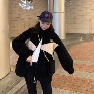 冬アウター フェイクラムウール中わた入り厚手ジャケット女性2024新しい冬ルーズスタンドアップカラー暖かい綿コート