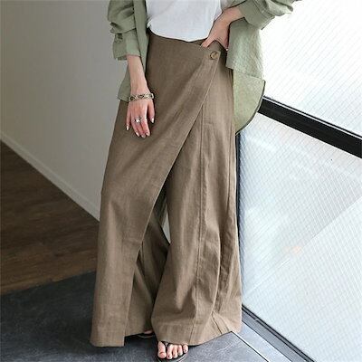 キュロットスカート パンツ ロングパンツ レディース ロング丈 マキシ丈 綿麻 イージーパンツ ハイウエスト リネン 無地 ズボン ボトムス コットン マキシパンツ ボタン ゆったり 体型カバー 着?