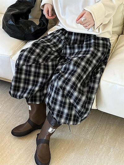 ワイドパンツ チェック柄 レディース 春 秋 ガウチョパンツ ワイド バルーンパンツ リラックス カジュアル きれいめ ボトムス ワイド ロング ズボン 切り替え 体型カバー 大きいサイズ ウエストゴ