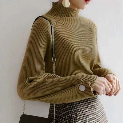 ニット レディース 袖ボタン ハイネック ニット タートル リブ フレアスリーブ プルオーバー 秋 冬 トップス 長袖 ゆったり ニットセーター 無地 リブニット 通勤 着痩せ 4色 30代 40代