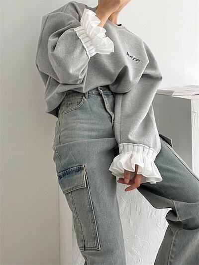 フリル袖トレーナー レディース 春 秋 長袖 トップス スウェット トレーナー 異素材切り替え フリル袖 無地 シンプル ゆったり カジュアル ボリューム袖 大きいサイズ ゆるっと 重ね着風 着?せ
