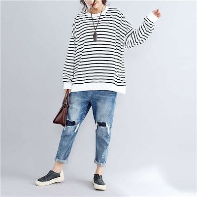 ボーダービッグプルオーバー スウェット プルオーバー レディース トップス カットソー 春 スウェット トレーナー ボーダー 丸首 長袖 パーカー 大きいサイズ ゆったり 綿混 コットン混 春秋 プル