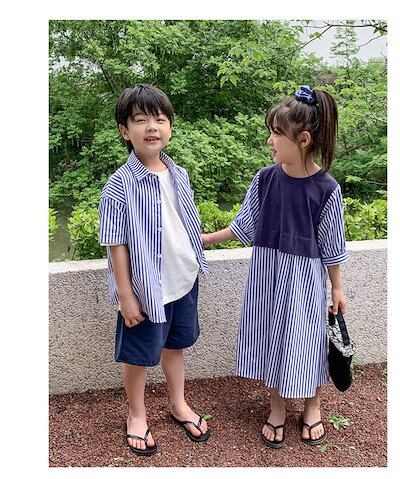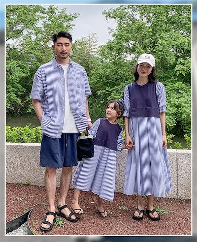 夏 親子服 ワンピース レディース リンクコーデ 親子セット シャツ 縞柄 ネイビー メンズ 親子ペアルック おそろい服 親子服 家族 ママと娘 父と息子 お揃い服 重ね着風 tシャツ 親子コーデ