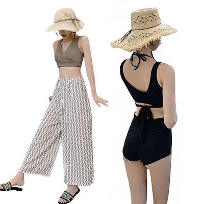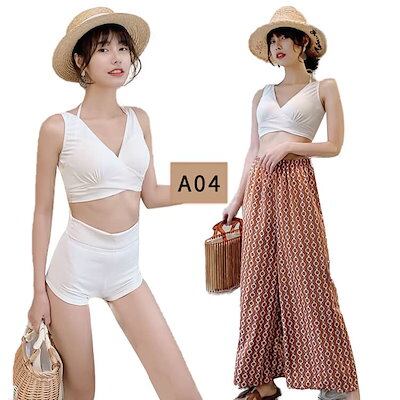 水着 レディース ビキニ バンドゥ 3点セット 水着 体型カバー リブニット水着 オトナ女子 みずぎ 脚 お尻 お腹 太もも カバーアップ 海 ビーチ プール