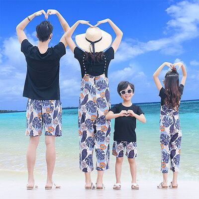 ペアルック tシャツ 上下セット 夏 親子お揃い 花柄 2点セット レディース メンズ キッズ 親子コーデ シャツ ワイドパンツ ペアルック ご家族お揃い 親子 海遊び 親子服 カップル ペア 親子お