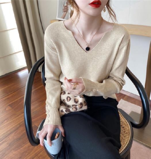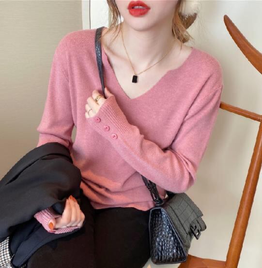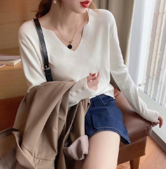 2022春秋新作 レディース 女 長袖 無地 ニット 毛糸 Vネック トップス Tシャツ インナー カットソー 7色