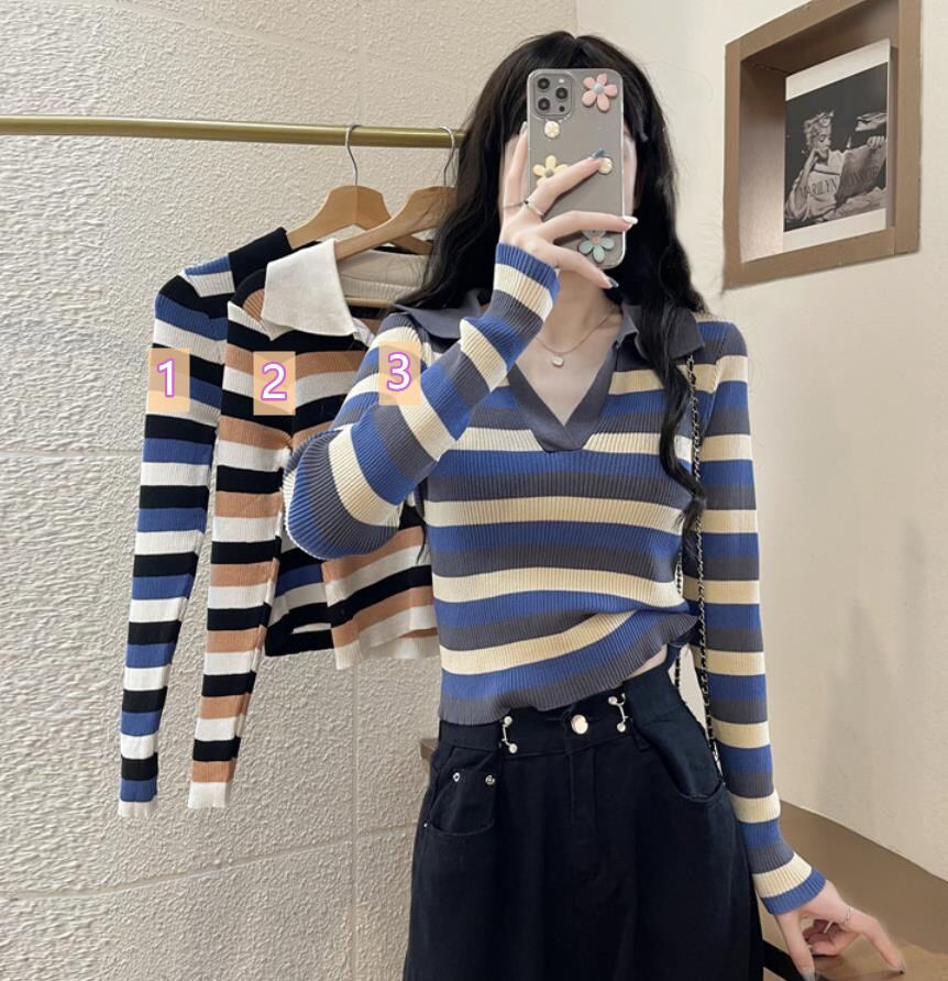 2022春秋新作 レディース 女 長袖 ニット ボーダー柄 トップス Tシャツ インナー カットソー 3色