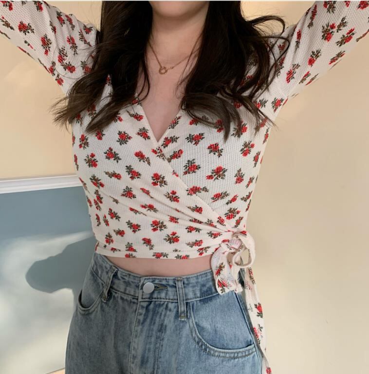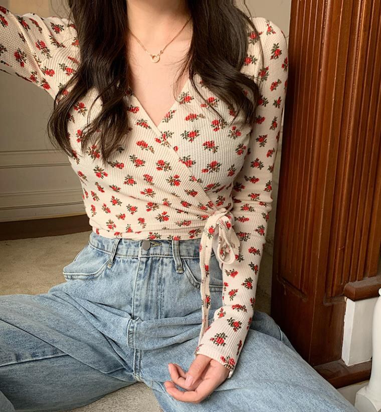 2022春秋新作 レディース 女 長袖 Vネック 花柄 ニット トップス Tシャツ インナー カットソー