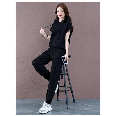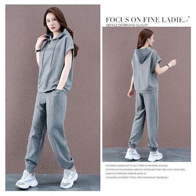 上下セットレティースセットアップパーカートップスフード付き半袖スポーツ運動着ボトムスロングパンツ大人かわいい夏