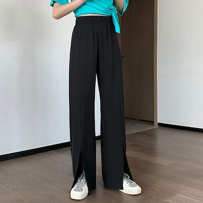 スリットパンツハイウエストカラーパンツレディースらくちんストレートパンツウエストゴムロングパンツおしゃれカジュアル無地ボトムスフレアパンツ
