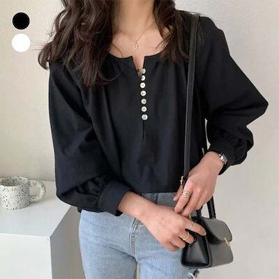 ブラウスフロントボタンカジュアル長袖トップスナチュラルヘンリーネック上品おすすめレディースオシャレトレンド人気プチプラ韓国ファッション2023秋冬作