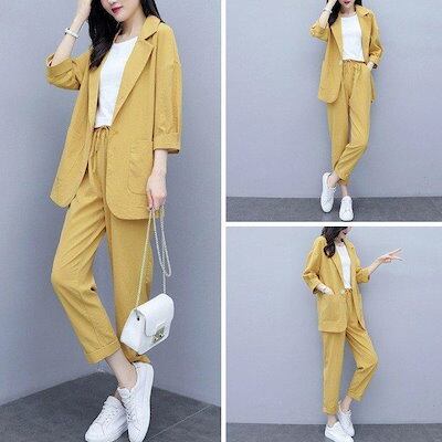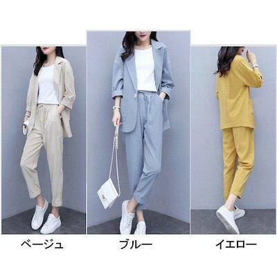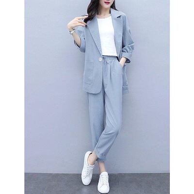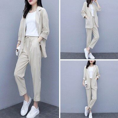 セットアップレディース春夏40フォーマルオフィス上下セット綿麻風七分袖スーツジャケット七分パンツ無地着痩せ韓国風通勤オシャレカジュアル