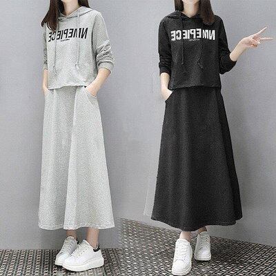セットアップレディース運動着/部屋着ロング丈タイトスカート上下セットスポーツウェアパーカーセットアップ運動会ジャージ