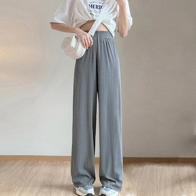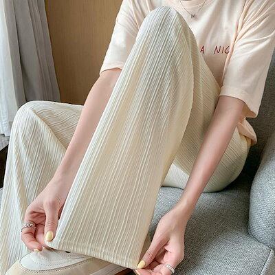 セミワイドパンツプリーツパンツ脚レディースボトムス韓国ストレートパンツロングパンツウエストゴムカジュアルフェミニンおしゃれデート服