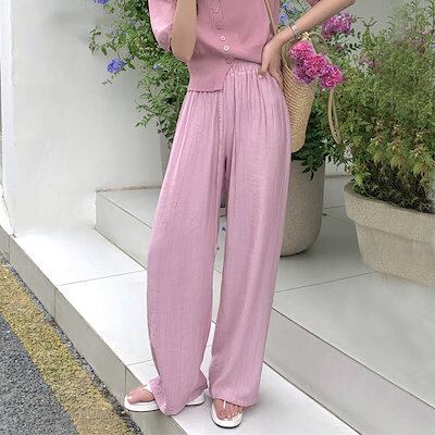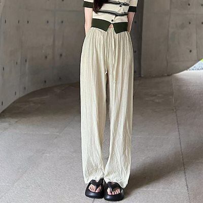 リラックスロングパンツ綿麻パンツ薄レディースセミワイドパンツ脚長無地オフィスカジュアルストレートパンツゆったりハイウエスト大人