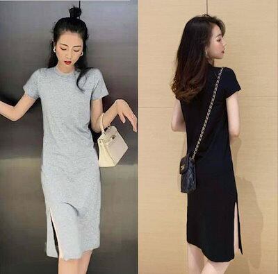 春夏膝丈ワンピースTシャツワンピーススリット入りモダール無地大きいサイズカシュクールクルーネックレディースドレス通勤上品セクシー