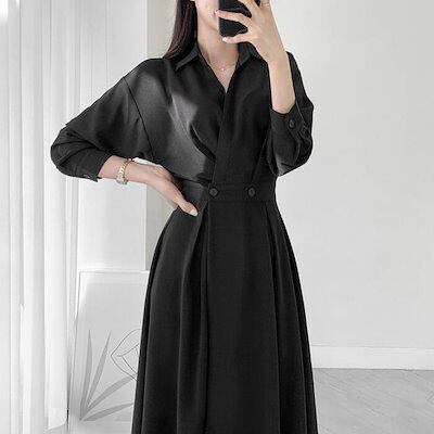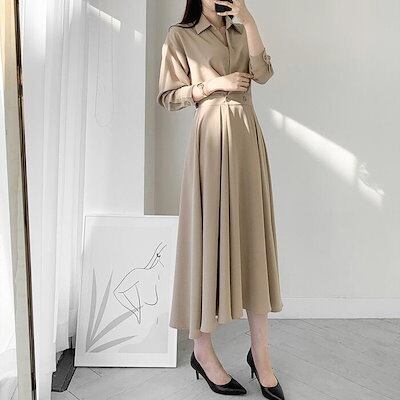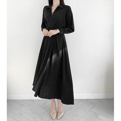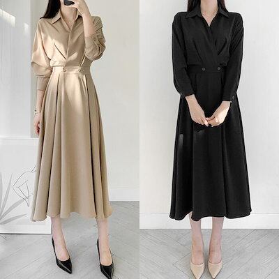 ワンピースロングワンピシャツワンピ袖ありカシュクール長袖Vネックエレガントレディースきれいめカジュアルミモレ丈おしゃれ大人可愛いドレスベージュブラック黒20304050