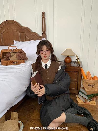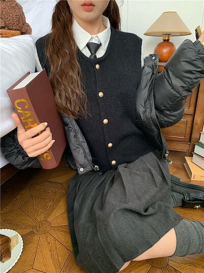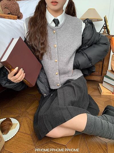 2024秋冬 柄 Vネック 甘め ニットベスト トップス ミニ丈 ショートセーター カーディガンレディースファッション系 jk 秋冬 黑白グレー 春 学生 高生 フレンチ