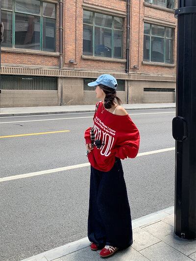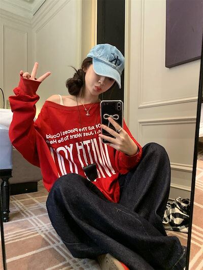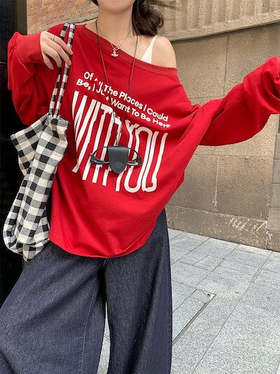 2024 秋冬 トップス 長袖 かわいいラウンドネック Tシャツ 肌見せ レディース ストレート 韓国風ルーズゆったりカジュアル おしゃれサイズ シルエットファッション系コーデ衣装上下セットアップ